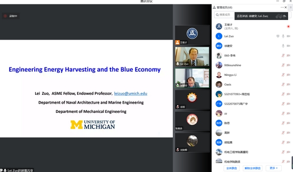 2022年11月11日9:00,学院邀请密歇根大学Lei Zuo教授为全校师生作了一场题为“Engineering Marine Energy and the Blue Economy”的学术报告。