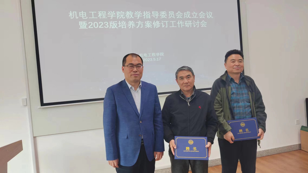 徐建安院长宣读机电学院新一届教学指导委员会委员名单和督导名单。教学指导委员会委员和教学督导都是学院资历深、能力强的教师,政治素养过硬、学术水平高、教学理念先进、教学经验丰富。徐建安院长向聘书并与教学指导委员会主任、教学督导合影留念。
