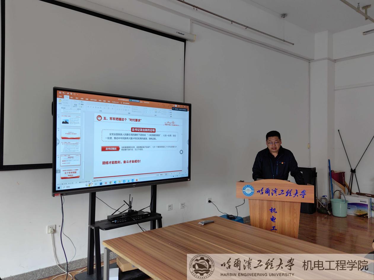 工业设计系党支部书记张文博同志以《五个牢牢把握 如何学习贯彻党的二十大精神》为题为2023届毕业生上最后一堂党课。张文博同志结合实际讲解了习近平总书记在党的二十大报告强调牢牢把握过去五年工作和新时代十年伟大变革的重大意义,牢牢把握新时代中国特色社会主义思想的世界观和方法论,牢牢把握以中国式现代化推进中华民族伟大复兴的历史使命,牢牢把握以伟大自我革命引领伟大社会革命的重要要求,牢牢把握团结奋斗的时代要求。张文博同志指出,哈工程研究生要贯彻党的二十大精神,将个人理想追求融入党和国家的事业之中,为全面建设社会主义现代化国家新征程添砖加瓦。