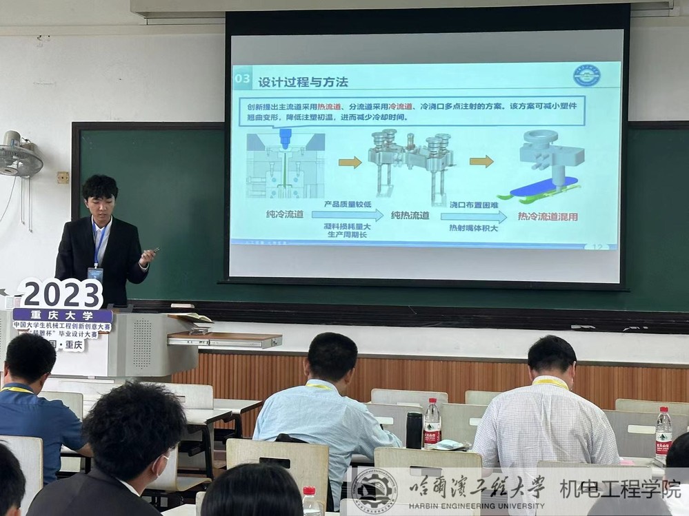 董纪龙同学针对在实际模内注塑(IMD)生产时复杂结构薄壁产品存在的翘曲变形、生产周期长、膜片与塑件贴合强度不足等问题,基于TRIZ创新方法与模流有限元分析,以冰箱内加湿器上盖为生产对象对模内注塑模具进行重设计,以优化产品质量、提高生产效率,并为生产类似的复杂结构薄壁件模内注塑模具提供理论与经验支撑。此课题获得了佳作奖,指导教师为史冬岩教授。