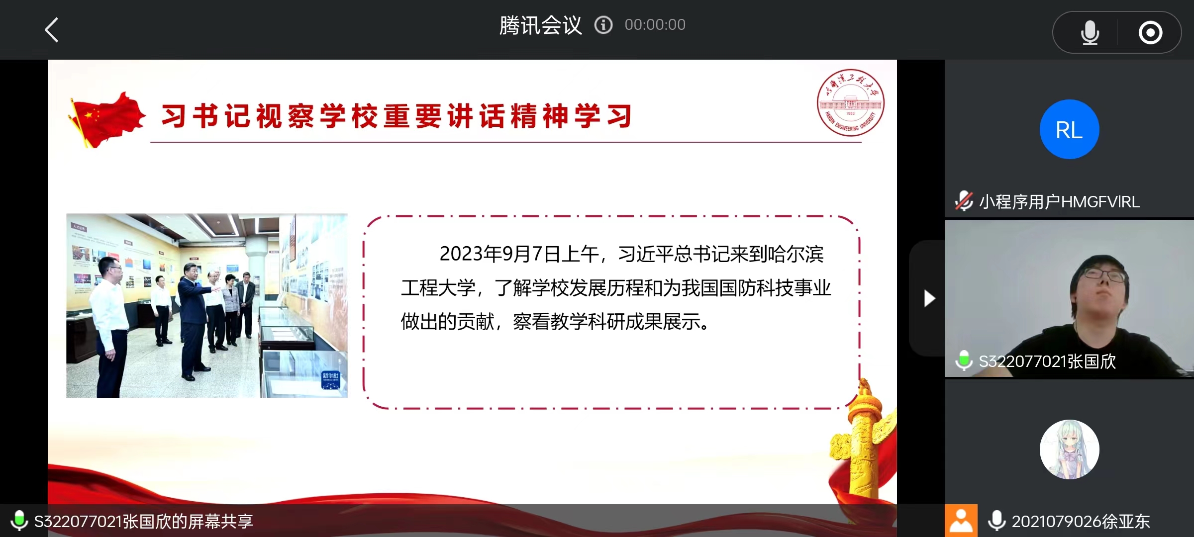 机械设计及自动化系学生第二党支部书记张国欣同志结合自身实习学习工作,宣讲习近平总书记视察bat365中文官方网站重要讲话精神。他介绍了当前参与课题项目的情况,分享了自己在企业实习的实践和体会,他强调:作为哈军工传承者的我们,当牢记总书记指示,不忘韶华,砥砺前行,以青春之我、奋斗之我,为祖国建设添砖加瓦,为全面建设社会主义现代化国家、全面推进中华民族伟大复兴贡献青春力量!