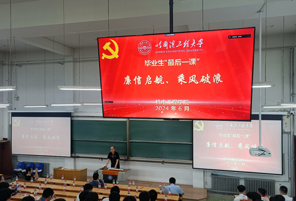 为加强毕业生廉洁教育,吕春雷书记以“廉信启航、“诚”风破浪”题为即将踏上新征程毕业生上“最后一课”。他指出,廉洁自律、诚实守信不仅是研究生在学术道路上积累的宝贵财富,更是未来在个人发展过程中立足的根本。他结合党的纪律学习教育案例,深入浅出地向毕业生们讲述了廉洁自律、诚实守信的重要性,并就如何在工作和生活中践行这一理念提出了具体可行的建议。他强调,廉洁自律是每一位青年学子的必修课,只有坚守道德底线,严于律己,才能在复杂多变的社会环境中保持清醒的头脑和坚定的立场。同时,他也强调了诚实守信的价值,认为真诚守信是赢得他人尊重和认可的关键。他鼓励毕业生们要秉持这一信念,在未来的工作和生活中不断锤炼自己的品行修养。他激励毕业生们要继承和发扬“哈军工”的优良传统,以科技报国为己任,努力成为报效祖国、造福人民的中坚力量。他鼓励毕业生们要勇于担当、敢于创新,以实际行动书写属于自己的辉煌篇章。